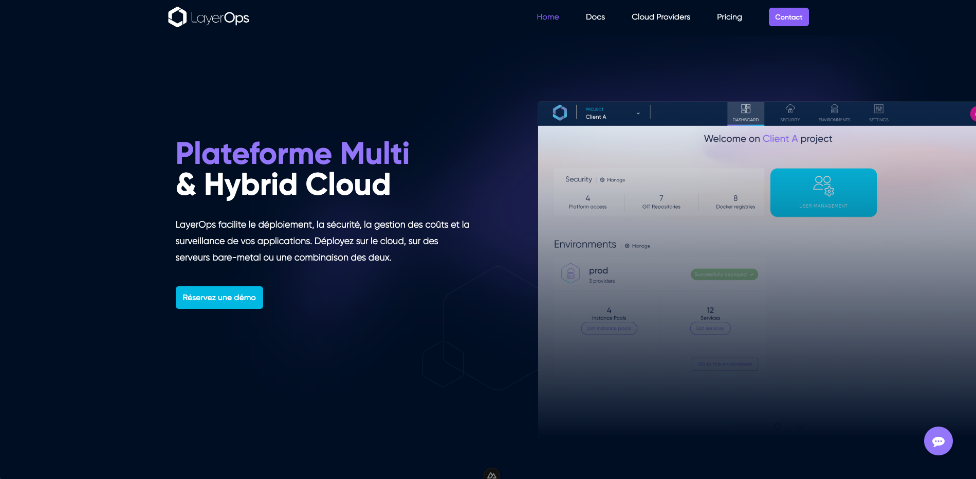 LayerOps facilite le déploiement, la sécurité, la gestion des coûts et la surveillance de vos applications. Déployez sur le cloud, sur des serveurs bare-metal ou une combinaison des deux.