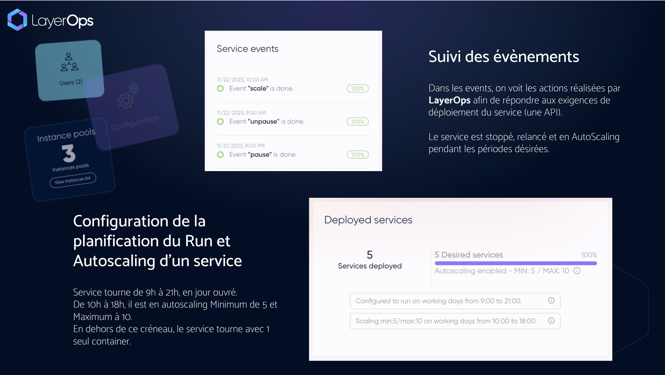 Intégrez LayerOps dans votre CI/CD pour des déploiements flexibles et profitez de notre autoscaling dynamique pour ajuster les ressources en fonction de la charge.